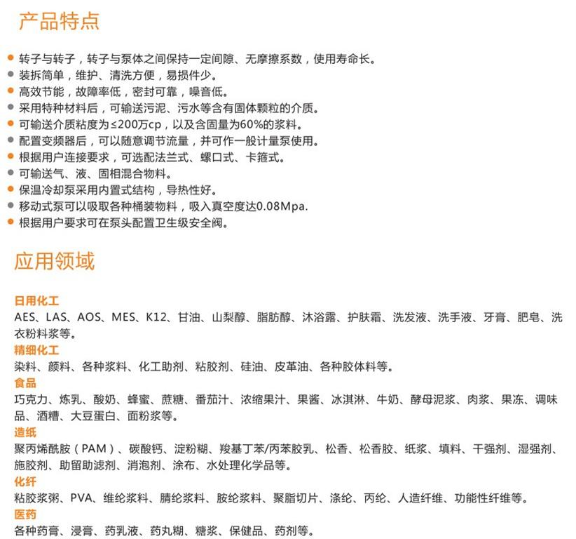 適用范圍廣:輸送高粘度、濃度及任務(wù)含顆粒的介質(zhì),是替代螺 桿泵的理想產(chǎn)品。本泵屬容積式泵,輸送流量可以較_的控制也可方便地制成變量泵。而離 心泵的輸出流量是不能控制的,隨身阻力的增加而下降;本泵有較強(qiáng)的自吸能力,而離 心泵在動(dòng)轉(zhuǎn)前_先充滿液體本泵的轉(zhuǎn)速很低,一般在200rmp至600rmp之間,被輸送的物料被平穩(wěn)地輸出而其成份不會(huì)受到破壞。而離 心泵的轉(zhuǎn)速很高,被輸送物料受到強(qiáng)力的撞擊以及離心力的作用,所以離 心泵在輸送混合物時(shí)經(jīng)常產(chǎn)生物質(zhì)成份不一的現(xiàn)象,使成品的質(zhì)量下降。而本泵正是解決這一問(wèn)題的佳選擇,所以它特別適用于輸送混合料甚至含有固體顆粒的物料,本泵可用于輸送粘度很高的物質(zhì),所以又稱(chēng)膠體泵。而離 心泵無(wú)此特性。本泵可以方便地制成輸出壓力較高的品種,適宜于長(zhǎng)距離或高阻力定量輸送。與螺 桿泵比較: 二者同屬容積式泵,所以其性能基本相近--能穩(wěn)輸送高粘度的物質(zhì),都有較高的輸送壓力。但螺 桿泵有一大的缺點(diǎn)決定了它不適用性--由螺 桿泵的非流線型曲面以及腔室內(nèi)眾多的缺陷決定了它使用的壽命短,而本泵由于轉(zhuǎn)子的流線結(jié)構(gòu)以及轉(zhuǎn)子室中基本沒(méi)有死點(diǎn)和非金屬件,對(duì)于高黏度的介質(zhì)更容易輸送。